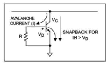 雙極型IC的箝位電路類似于在受保護核電路中提供一個受沖擊時擊穿的部件,圖3給出了圖1中箝位功能的詳細電路。箝位晶體管的過壓導(dǎo)致集電極-基極之間的雪崩電流,發(fā)射結(jié)的正向偏置會進一步提高集電極電流,導(dǎo)致一個“突變”過程。箝位時的V-I特性曲線如圖4所示。