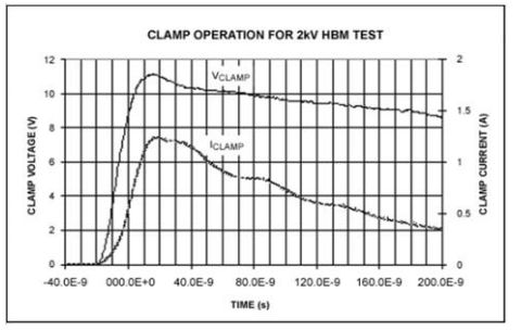 箝位二極管在IC其它電路遭到破壞之前導(dǎo)通,箝位管要有足夠的承受力,保證ESD電流不會導(dǎo)致二次擊穿。2kV HBM測試的箝位過程如圖5所示,圖5中的電壓包括I-R壓降和突變穩(wěn)定后的箝位電壓。