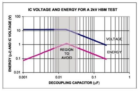 對于高速雙極型IC,HBM測試中吸收的最大能量是1μJ;2kV人體模式下,如果電容小于0.02μF(圖 6),C1>>C0二極管會產(chǎn)生動作。為了使去耦電容的能量低于1μJ,去耦電容有兩種選擇:要么容值大于0.05μF,要么小于 0.005μF。當使用更高的測試電壓時,要按比例增大0.05μF電容的尺寸。