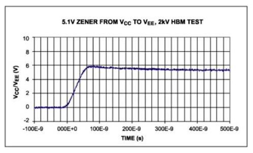 電源去耦電容會影響箝位操作,傳遞到去耦電容的電荷會產(chǎn)生高于IC絕對最大值的電壓,但還不足以使箝位電路導(dǎo)通。這時的電容相當于一個能源,迅速向器件注入能量。