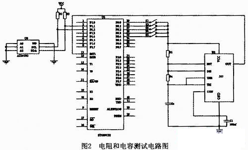 單片機(jī)測(cè)得振蕩輸出的頻率,計(jì)算后即可得到電阻和電容的值。不同量程對(duì)應(yīng)不同的電路參數(shù),利用開關(guān)可方便地選擇對(duì)應(yīng)不同量程的對(duì)應(yīng)電路。