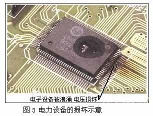 ⑵ 電力設(shè)備的損壞。干擾信號(hào)和浪涌對電路的不利影響是每一個(gè)電力工程師都不能忽視的問題。在過去繼電器的短時(shí)間過載輸入可能是沒有危險(xiǎn)的,但是在使用半導(dǎo)體電路的時(shí)代里,即使是低能量脈沖也能造成損壞或操作失敗,其損壞見圖3所示。