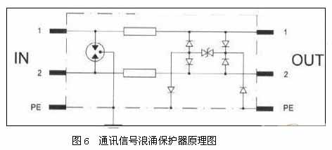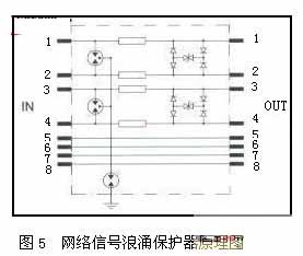 BAx系列信號(hào)浪涌保護(hù)器是專為通過雙絞線進(jìn)行信號(hào)傳輸?shù)脑O(shè)備而設(shè)計(jì),以保護(hù)其避免遭受感應(yīng)過電壓和操作過電壓的損害。該浪涌保護(hù)器輸入、輸出采用RJ45公/母于接頭串聯(lián)保護(hù)。網(wǎng)絡(luò)信號(hào)浪涌保護(hù)器原理圖見圖5所示。