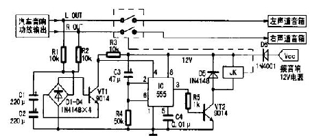 1.在接通音響電源的瞬間,因電容C3兩端電壓不能突變,可視為短路,則時(shí)基電路555的②、⑥腳電位高于2/3 Vcc,故555處于復(fù)位狀態(tài),③腳輸出低電平,晶體管VT2截止,繼電器JK常開觸點(diǎn)不動(dòng)作。同時(shí)+12 V電壓通過電阻R4向電容C3充電,延時(shí)約5s(秒鐘)后555的②、⑥腳電位降低至1/3Vcc,555被觸發(fā)置位,③腳由低電平變?yōu)楦唠娖?,晶體管VT2導(dǎo)通,繼電器JK得電,常閉觸點(diǎn)閉合,從而實(shí)現(xiàn)了延遲一段時(shí)間將揚(yáng)聲器接入功放,徹底消除了開機(jī)時(shí)大電流對(duì)揚(yáng)聲器的沖擊;