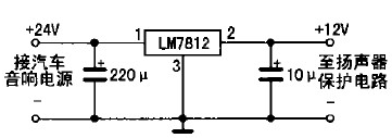 具體制作如下:先把功放輸出端與音箱的引線切斷,按圖2所示電路將引線頭a、b分別接功放的兩組輸出端,c、d分別接左、右聲道音箱:揚(yáng)聲器保護(hù)電路的電源只能從收放機(jī)中獲取,不可直接從汽車12 v電源中獲取,否則不起開/關(guān)機(jī)保護(hù)作用;若是柴油車所配置的收放機(jī)(使用24 V電源),則要求增加一個(gè)降壓電路(見圖3所示),給揚(yáng)聲器保護(hù)電路供電,以免電源電壓過高損壞IC。