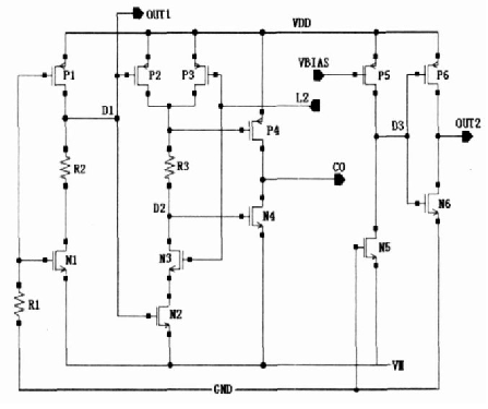 圖1中N1,N2, P1, P2, P3, C1作為啟動(dòng)電路,有源電阻P1, P2 起限流作用。N5, P13 為開關(guān)管,當(dāng)保護(hù)電路處于休眠狀態(tài)時(shí),電路必須停止工作,使功耗降為最低,此時(shí)通過內(nèi)部控制電路使L1 為低電位, P13 管打開,使偏置點(diǎn)VB IAS上升為高電位,P4, P7, P8, P9 , P10, P11, P12管截止,N5管關(guān)閉,切斷由P13,N6形成的支路,該電路停止工作,電流幾乎為零。經(jīng)仿真,該基準(zhǔn)電路在2. 2V電壓下可正常工作。