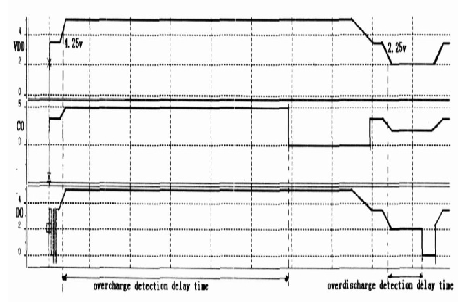 圖5為過充與過放電檢測的HSPICE仿真時(shí)序圖,從中可以看出,當(dāng)比較器檢測到電池過充,在這里過充檢測點(diǎn)為4. 25V,且該狀態(tài)保持時(shí)間達(dá)到過充電檢測延遲時(shí)間,在這里約為1. 2秒, CO輸出低電平,關(guān)斷充電用FET2,停止充電。當(dāng)檢測到電池過放電,這里過放電檢測點(diǎn)為2. 25V,且該狀態(tài)保持時(shí)間達(dá)到過放電檢測延遲時(shí)間約150毫秒,DO輸出低電平,關(guān)斷放電用FET1,停止放電。其它如放電過流檢測等功能經(jīng)HSP ICE仿真完全符合要求,在這里不一一列出。