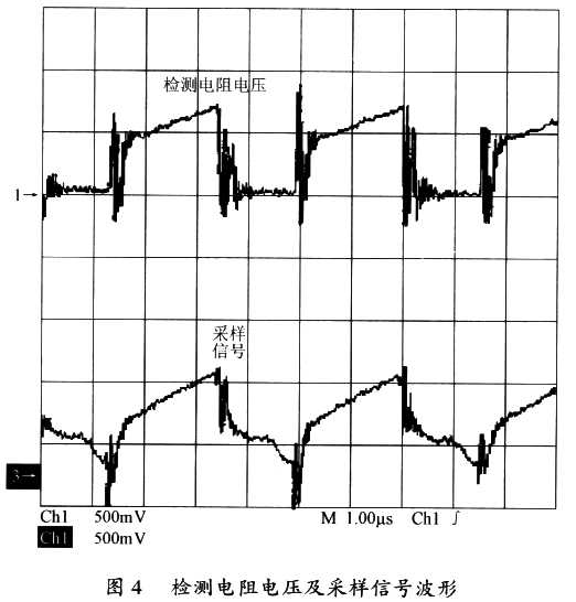 圖4給出了UC3842檢測電阻的電壓波形和采樣信號波形。從圖4中可以看出,經(jīng)過改進(jìn)后的電路,其采樣信號的波形緊緊跟隨檢測電阻的電壓波形,沒有出現(xiàn)非常大的尖峰電壓。因此,該電路能有效避免因變壓器漏感等異常干擾引起的電源誤操作的問題,也能有效避免因電源占空比過大而引起的系統(tǒng)不穩(wěn)定的問題。