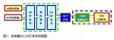 傳感器作為信號(hào)采集和機(jī)電轉(zhuǎn)換的器件,其機(jī)電技術(shù)都已相當(dāng)成熟,近幾年MEMS技術(shù)興起又將傳感器技術(shù)向小型化、智能化、多功能化、低成本化大踏步邁進(jìn)。光敏傳感器、紅外傳感器等各種類型的傳感器都可與LED照明燈具組成一個(gè)智能控制系統(tǒng),傳感器將采集來(lái)的各種物理量信號(hào)轉(zhuǎn)換成電信號(hào),可以經(jīng)由集成電路化的AD轉(zhuǎn)換器、MCU、DA轉(zhuǎn)換器對(duì)所采集的信號(hào)進(jìn)行智能化處理,從而控制LED照明燈具開(kāi)啟和關(guān)閉。人類可以籍此在MCU上設(shè)定各種控制要求,控制LED燈的開(kāi)關(guān)時(shí)間、亮度、顯色、多彩變幻,從而達(dá)到省電節(jié)能的目標(biāo)。傳感器與LED燈具組成的系統(tǒng)框圖如圖1所示。目前的集成電路制造技術(shù)已經(jīng)可以將AD、DA、MCU集成在一個(gè)5X5mm或更小的封裝內(nèi),安裝在燈具內(nèi)既不占面積而且十分方便。