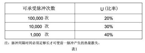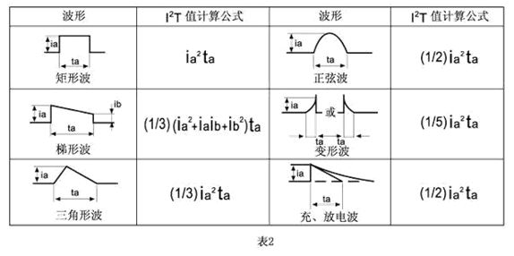 脈沖產(chǎn)生熱循環(huán),從而產(chǎn)生機(jī)械疲勞影響保險絲管壽命。設(shè)計時應(yīng)使脈沖I2T遠(yuǎn)遠(yuǎn)小于保險絲管標(biāo)稱熔化熱能I2T。保險絲管壽命(可承載的脈沖循環(huán)次數(shù))與U(脈沖I2T值之比率)的關(guān)系參照表1.本目錄提供的各種規(guī)格的保險絲管熔化熱能I2T可供參考,表2提供各種典型脈沖波形的I2T值近似計算公式: