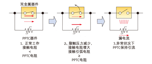 在正常狀態(tài)下,由于雙金屬片的電阻低,電流通過雙金屬片流過。在異常情況下,比如電動工具轉(zhuǎn)子堵轉(zhuǎn)時,電路中將產(chǎn)生很高的電流,導(dǎo)致雙金屬觸點(diǎn)打開,其接觸電阻增加。此時電流將通過低電阻的PPTC流過。流過PPTC的電流,不僅抑制了觸點(diǎn)之間電弧的產(chǎn)生,同時又加熱雙金屬片,使其保持在打開狀態(tài)和鎖定位置。