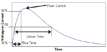 系統(tǒng)所經(jīng)歷的電氣應(yīng)力是各種各樣的: 有納秒上升時(shí)間且持續(xù)數(shù)以10計(jì)的安培電流的靜電放電(ESD)應(yīng)力;有微秒上升時(shí)間且持續(xù)數(shù)以萬計(jì)的安培電流的閃電應(yīng)力。對(duì)可以想到的現(xiàn)實(shí)世界中的每一種應(yīng)力都進(jìn)行產(chǎn)品測量是不可能的。所以標(biāo)準(zhǔn)機(jī)構(gòu)制定了針對(duì)每個(gè)特定的應(yīng)力威脅制定了專門的測試標(biāo)準(zhǔn)。這些標(biāo)準(zhǔn)以電壓和電流波形的形式來表示應(yīng)力。最常見的一種應(yīng)力波形就是圖示的雙指數(shù)波形。典型的電壓波型是被理解成開路,而典型的電流波型是被理解為短路。通常一個(gè)波形的參數(shù)包括峰值電壓、峰值電流、上升時(shí)間(通常是峰值時(shí)間的10%到90%)以及衰減時(shí)間(峰值時(shí)間的50%)。標(biāo)準(zhǔn)同樣規(guī)定了如何把應(yīng)力波形應(yīng)用到實(shí)際的被測試的設(shè)備以及通過或者未通過測試的準(zhǔn)則。這就確保了測試結(jié)果可以被任何一個(gè)做此種測試的人重現(xiàn)出來,并且通過這個(gè)測試的系統(tǒng)可以可靠地工作。