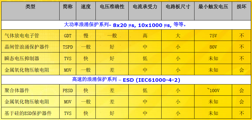 市場上有一系列對(duì)電子系統(tǒng)起保護(hù)作用的產(chǎn)品。下表簡單描述了各種產(chǎn)品的特征。
