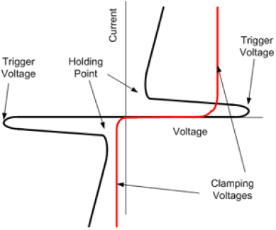 圖示:雙向消弧保護(hù)器件(黑色)和單向鉗位保護(hù)器件(紅色)的I-V曲線