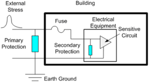 初級(jí)和次級(jí)保護(hù)的應(yīng)用非常普遍。這個(gè)概念在電信產(chǎn)業(yè)中用于閃電和浪涌保護(hù),也在先進(jìn)集成電路技術(shù)中做靜電放電(ESD)保護(hù)。初級(jí)的保護(hù)元件較貼近應(yīng)力源,主要目的是用于承受大部分的電流應(yīng)力,而次級(jí)保護(hù)元件則非常貼近敏感的電路元件,在最需要的地方提供保護(hù)。