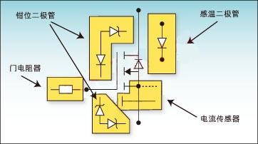 突出顯示的元件組成一個(gè)特性板,可以將其中的功能集成到MOSFET中。這些元件從右上角開始按順時(shí)針方向?yàn)椋簻囟雀袘?yīng)二極管、電流傳感器、鉗位二極管(內(nèi)部二極管,未顯示)和門電阻器。通過加入鉗位二極管和門電阻器眾所周知的保護(hù)特性,可以保護(hù)對(duì)電壓敏感的柵氧化層免受危險(xiǎn)電場(chǎng)的破壞。