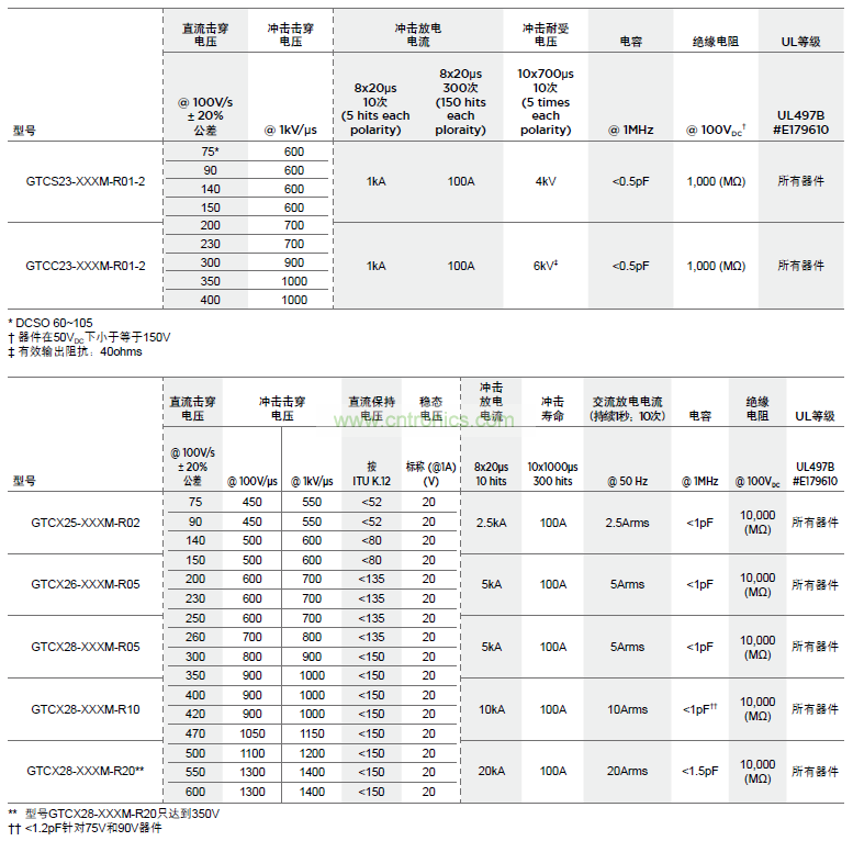 表 G2 兩電極高壓GDT器件額定電壓值、額定浪涌值、電容值、絕緣電阻值和安規(guī)認證