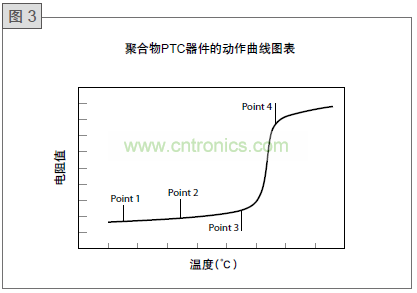 在圖3的Point 1時(shí)溫度較低,產(chǎn)生的熱量和散發(fā)的熱量達(dá)到平衡,但是當(dāng)流過的電流較多或是環(huán)境溫度較高時(shí),會產(chǎn)生較高的熱量,而提高PolySwitch器件的溫度,然而當(dāng)電流或環(huán)境溫度的增加并不顯著,PolySwitch器件所產(chǎn)生的熱量可以散發(fā)至環(huán)境中而