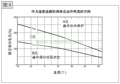 圖4說明了作為溫度函數(shù)的PolySwitch器件的保持和動作電流行為??梢詾槊總€(gè)可用器件定義一條這樣的曲線。A區(qū)說明了PolySwitch器件將動作 (轉(zhuǎn)到高電阻狀態(tài)) 以保護(hù)電路時(shí)的電流和溫度的組合。B區(qū)說明了PolySwitch器件將允許電路正常操作的