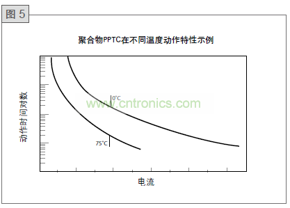 圖5顯示了在0℃和75℃下的靜止空氣中聚合PTC器件的一對典型運(yùn)行曲線對。這些曲線是不同的,因?yàn)樾枰獎幼髌骷臒崃縼碜?br /> 電氣I2R加熱和器件環(huán)境。75℃時(shí)環(huán)境的熱量輸入要比0℃的熱量輸入大得多,因此動作所需要的附加I2R相對較少,造成在給定的動作時(shí)間內(nèi)的較低的動作電流(或在給定的動作電流下動作更快)。