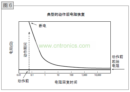 圖6顯示了動作和隨后允許冷卻的PolySwitch器件的典型行為。在此圖中,我們可以清楚地看到,即使在若干小時(shí)以后,器件電