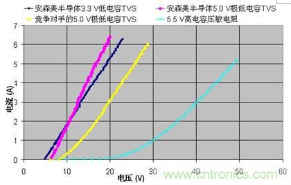 結(jié)合ESD脈沖測(cè)試和TLP測(cè)試,我們可以得出結(jié)論,在不同ESD保護(hù)元件中,TVS元件,特別是安森美半導(dǎo)體的TVS元件的大電流導(dǎo)電率極佳,且在重復(fù)應(yīng)力條件下仍能維持優(yōu)異性能,不存在壓敏電阻或聚合物那樣的使用增多后會(huì)出現(xiàn)性能下降的問(wèn)題;至于其在電容方面的不足,也隨著新的低電容設(shè)計(jì)的出現(xiàn),而消除了早前的大電容問(wèn)題。