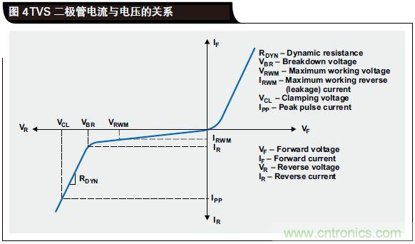 圖 4 顯示了 TVS 二極管電流與電壓特性的對比情況。盡管 TVS 是一種簡單的結(jié)構(gòu),但是在系統(tǒng)級 ESD 保護(hù)設(shè)計過程中仍然需要注意幾個重要的參數(shù)。這些參數(shù)包括擊穿電壓 VBR、動態(tài)電阻 RDYN、鉗位電壓 VCL 和電容。