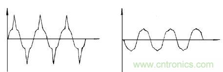 圖4中在開啟或關(guān)閉帶有感性, 容性的負(fù)載電路時(shí), 直流波形出現(xiàn)開關(guān)尖脈沖, 壓敏電阻將吸收這種反電動(dòng)勢(shì), 有效地保護(hù)開關(guān)電路、變電壓。