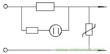 當(dāng)使用電壓超過壓敏電阻標(biāo)稱值電壓時(shí), 在毫微秒的時(shí)間內(nèi), 壓敏電阻的阻值急劇下降, 流過壓敏電阻的電流急劇增加, 保險(xiǎn)絲熔斷, 使照明燈具線路斷電而得到保護(hù), 同時(shí)并聯(lián)在保險(xiǎn)絲兩端的氖燈點(diǎn)亮,發(fā)出保險(xiǎn)絲已熔斷的警告。