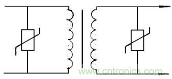 圖6中在特殊條件下使用的照明燈具, 要求極為嚴(yán)格, 采用了隔離變壓器, 這時(shí)壓敏電阻應(yīng)在隔離變壓器的初級(jí), 次級(jí)線圈繞組兩端同時(shí)使用壓敏電阻器, 它能吸收抑制來(lái)自輸入電壓的浪涌, 過壓雷擊或開關(guān)引起的電火花干擾等。