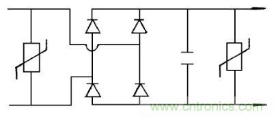 在圖10線路中壓敏電阻并聯(lián)在橋式整流的輸入端、輸出端, 防止和保護(hù)由輸入的交流電過電壓、反電動(dòng)式的過電壓、雷擊; 開、關(guān)產(chǎn)生的過電壓, 使整流元件不受過電壓的損傷, 減少開機(jī)的噪聲。