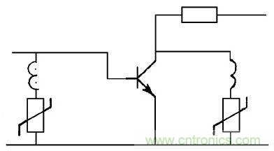 圖11在晶體管電路中, 三極管的e 極和b 極間, c級(jí)與b 級(jí)間帶有感性的負(fù)載兩端, 都可以并聯(lián)壓敏電阻; e 極與c 極接上壓敏電阻器, 能防止輸入過電壓雷擊損壞晶體管。當(dāng)所控制的負(fù)載屬感性的變壓器、鎮(zhèn)流器、電感、逆變器等, 在c 級(jí)與b 極間或者在負(fù)載線圈兩端并接壓敏電阻, 能有效地抑制電壓對(duì)晶體管的損傷。當(dāng)電路正常工作時(shí), 壓敏電阻處于高阻抗?fàn)顟B(tài), 而電路中產(chǎn)生過電壓時(shí), 壓敏電阻在毫微秒內(nèi)導(dǎo)通, 限制過電壓的幅度, 使晶體管免受損壞。