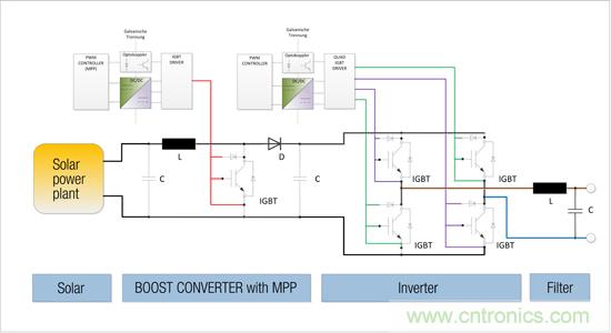 圖1:帶助推器和逆變器(頂部)的太陽能發(fā)電廠功能圖。每個(gè)IGBT驅(qū)動器都有一個(gè)良好的帶隔離的DC/DC轉(zhuǎn)換器供電。設(shè)備通過一個(gè)高頻PWM信號控制,這個(gè)信號輸出平滑的正弦波(左)。
