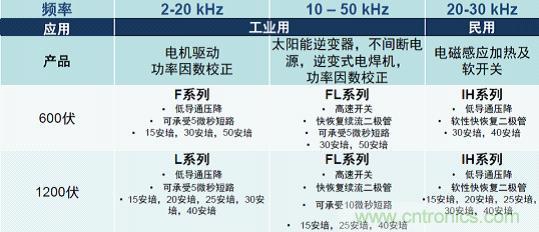 安森美半導(dǎo)體提供完善的IGBT產(chǎn)品系列,可以根據(jù)頻率、應(yīng)用和電壓進(jìn)行分類 (表1),不同產(chǎn)品有不同的特性和應(yīng)用范圍。