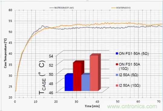 安森美半導(dǎo)體的客戶已成功使用其場(chǎng)截止型第一代IGBTNGTB50N60FLWG開發(fā)出了各種應(yīng)用,如功率10 千伏安、功率因數(shù)0.9的不間斷電源,以及采用半橋諧振拓?fù)浣Y(jié)構(gòu)的1450瓦廚用電爐??蛻粽J(rèn)為,安森美半導(dǎo)體場(chǎng)截止型第一代IGBT的性能達(dá)到了市場(chǎng)上最好的性能;其IGBT在電磁爐上的溫升低于其它2款I(lǐng)GBT。