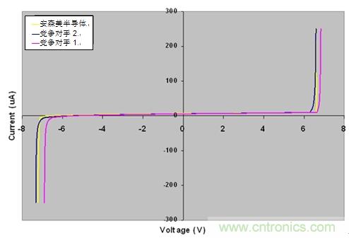 當(dāng)對以上器件的DC性能進行比較的時候,結(jié)果看起來似乎是相同的(參見圖2所示曲線)。此外,它們都聲稱符合IEC61000-4-2第4級標(biāo)準(zhǔn),這就意味 著它們將都經(jīng)受住高達(dá)8 kV接觸電壓的ESD沖擊。確保保護敏感IC的ESD保護器件至關(guān)重要的性能不是DC性能; 盡管器件符合IEC61000-4-2的第4級標(biāo)準(zhǔn)是重要,但更重要的是保護IC。為確保在ESD事件期間IC沒有被損壞,保護二極管必須把ESD電壓鉗 位至足夠低的值,使IC不會損壞。