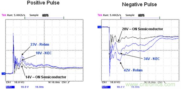 為了比較每個器件的鉗位性能,利用示波器來截取ESD發(fā)生期間的電壓波形。利用完全相同的測試條件,對上述器件進行并排測試。圖3中顯示出每個二極管對正/負(fù)ESD脈沖的響應(yīng)曲線。所用的輸入脈沖為IEC61000-4-2第4級的標(biāo)準(zhǔn)接觸電壓(8 kV)。