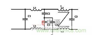 EMI濾波技術(shù)是一種抑制尖脈沖干擾的有效措施,可以濾除多種原因產(chǎn)生的傳導(dǎo)干擾。圖3是一種由電容、電感組成的EMI濾波器,接在開關(guān)電源的輸入端。電路中,C1、C5是高頻旁路電容, 用于濾除兩輸入電源線間的差模干擾;L1與C2、C4;L2與C3、C4組成共模干擾濾波環(huán)節(jié),用于濾除電源線與地之間非對稱的共模干擾;L3、L4的初次級匝數(shù)相等、極性相反,交流電流在磁芯中產(chǎn)生的磁通相反,因而可有效地抑制共模干擾。測試表明,只要適當(dāng)選擇元器件的參數(shù),便可較好地抑制開關(guān)電源產(chǎn)生的傳導(dǎo)干擾。