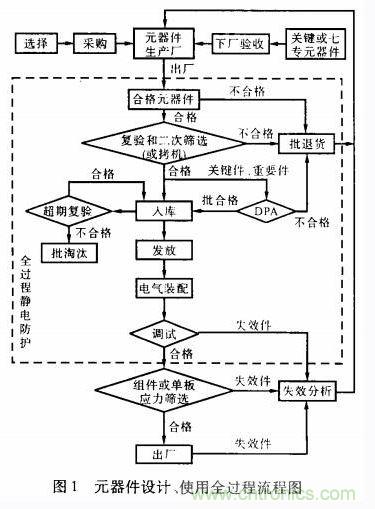 元器件使用全過程包括選擇、采購、監(jiān)制、驗收、篩選(拷機)、破壞性物理分析(DPA)、保管、使用、電氣裝配、通電調(diào)試、靜電防護和失效分析等。元器件的選擇和使用全過程流程圖如圖1所示。