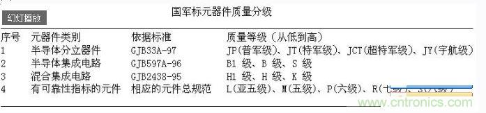 元器件的質(zhì)量等級是指元器件裝機使用之前,按產(chǎn)品執(zhí)行標準或供需雙方的技術(shù)協(xié)議,在制造、檢驗及篩選過程中對其質(zhì)量的控制等級。質(zhì)量等級越高,其可靠性等級就越高。