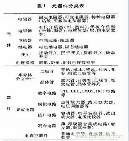 顧名思義,元器件可分為元件和器件2大類。元件中有電阻、電容、電感、繼電器和開關(guān)等;器件可分為半導(dǎo)體分立器件、集成電路以及電真空器件等。表1為元器件分類表。