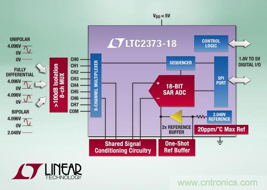 【導(dǎo)讀】近日,凌力爾特公司宣布推出具排序器的 18 位、1Msps、8 通道的逐次逼近寄存器 ADC LTC2373-18,該器件擁有卓越的 100dB SNR 性能。LTC2373-18 具可編程排序器,可存儲多達(dá) 16 個控制字,以配置多工器 (MUX) 和輸入范圍。