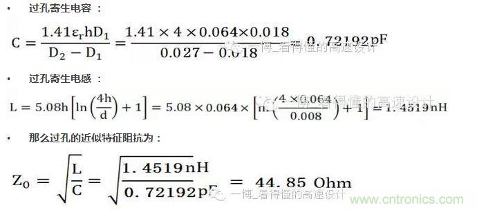 此公式是將過孔等效為傳輸線的模型來計(jì)算的,如果常規(guī)我們單端信號(hào)是50歐姆的特征阻抗,過孔的阻抗如上計(jì)算約為45歐姆,拉低了整體的特征阻抗,所以說呈現(xiàn)容性效應(yīng)。