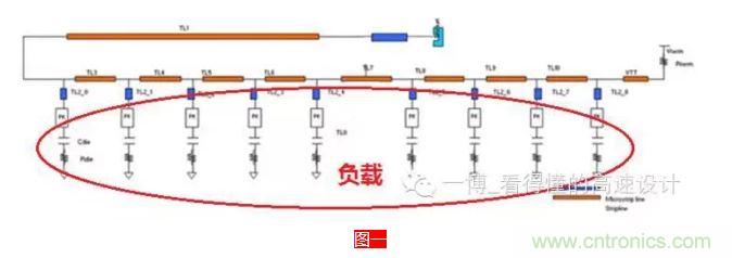 容性負(fù)載?是負(fù)載呈容性,還是帶容性的負(fù)載?呵呵,這不一個(gè)意思嘛,中國的語言,難怪老外覺得很難搞懂,自己人都被繞暈了。負(fù)載怎么會(huì)呈容性呢?這個(gè)主要是在多負(fù)載的情況下,如下圖一所示,由于分支和負(fù)載較多,不可避免的會(huì)增加過孔來連通信號(hào),普通過孔是呈容性的,其次還有芯片封裝上的寄生電容(約0.33~0.44pF),另外還有Die上的寄生電容(約0.77~2.12pF),所有的這些電容會(huì)降低信號(hào)線的有效特征阻抗。