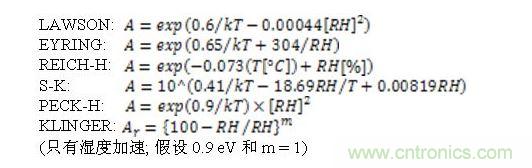 檢索現(xiàn)有文獻,Peck是提到的另一個作者。他改變了Lawson建議值,發(fā)現(xiàn)使用相對濕度能夠適應他自己的測試結果。在一篇文章里,Hallberg很好地概括了所有濕度測試和加速模型,包括他自己的。過去30年,他與Peck對濕度加速進行了大量研究。在很多出版物里都提到,他們的研究成果的適應性最好。圖8是Hallberg收集的可用模型。除了溫度意外,他們都使用相對濕度做為主要的測量參數(shù)。檢索最近幾年有關濕度加速的出版物,我們發(fā)現(xiàn),人們還在使用與Hallberg和Peck 描述或收集的模型相同的或可比較的模型。