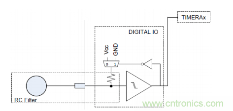 MSP430根據(jù)型號的不同支持多種電容觸摸檢測方式,有RC 震蕩、比較器、PIN RO,本設計使用的是PIN Relaxation Oscillator 方式,原理如圖,芯片管腳內(nèi)部檢測電路由施密特觸發(fā)器、反向器,以及一個電阻組成,震蕩信號經(jīng)過施密特觸發(fā)器變成脈沖信號,再通過反向器反饋回RC 電路,通過Timer_A對施密特觸發(fā)器的輸出進行記數(shù),再通過設置測量窗口Gate 獲得記數(shù)的結果。當手指觸摸電極,電極上的C 產(chǎn)生變化,導致震蕩頻率改變,這樣在定長的測量窗口就能獲得不同的記數(shù)結果,一旦差值超過門限,結合一定的濾波算法判斷就可以觸發(fā)觸摸事件。