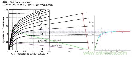 圖中假定電源電壓為4V,綠色的斜線是負(fù)載電阻為80歐姆的負(fù)載線,V/R=50MA,圖中標(biāo)出了Ib分別等于0.1、0.2、0.3、0.4、0.6、1.0mA的工作點(diǎn)A、B、C、D、E、F。據(jù)此在右側(cè)作出了Ic與Ib的關(guān)系曲線。根據(jù)這個(gè)曲線,就比較清楚地看出“飽和”的含義了。曲線的綠色段是線性放大區(qū),Ic隨Ib的增大幾乎成線性地快速上升,可以看出β值約為200。蘭色段開始變彎曲,斜率逐漸變小。紅色段就幾乎變成水平了,這就是“飽和”。實(shí)際上,飽和是一個(gè)漸變的過(guò)程,蘭色段也可以認(rèn)為是初始進(jìn)入飽和的區(qū)段。在實(shí)際工作中,常用Ib*β=V/R作為判斷臨界飽和的條件。在圖中就是假想綠色段繼續(xù)向上延伸,與Ic=50MA的水平線相交,交點(diǎn)對(duì)應(yīng)的Ib值就是臨界飽和的Ib值。圖中可見該值約為0.25mA。