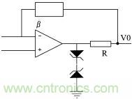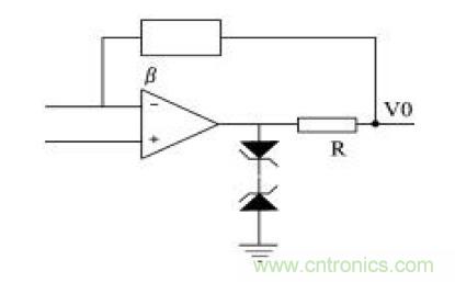 (3)輸出保護(hù)。當(dāng)集成運(yùn)放過載或輸出端短路時(shí),若沒有保護(hù)電路,該運(yùn)放就會(huì)損壞。但有些集成運(yùn)放內(nèi)部設(shè)置了限流保護(hù)或短路保護(hù),使用這些器件就不需再加輸出保護(hù)。對于內(nèi)部沒有限流或短路保護(hù)的集成運(yùn)放,可以采用下圖所示的輸出保護(hù)電路。在下圖電路中,當(dāng)輸出保護(hù)時(shí),由電阻R起限流保護(hù)作用。