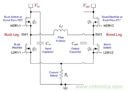 圖1. 4開關(guān)同步降壓-升壓轉(zhuǎn)換器功率級。