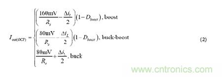 根據(jù)針對電流限值的相關(guān)閾值設(shè)定分路電阻。例如,方程式2適用于LM5175,并在降壓中指定80mV谷值閾值,在升壓中指定160mV的峰值閾值。當(dāng)升壓占空比在其最大值時(shí),分路功率耗散在最低輸入電壓上達(dá)到峰值。一個(gè)寬縱橫比分路電阻器,比如說封裝規(guī)格為1225的電阻器,有利于將PCB布局布線中的元件放置位置[5]靠近兩個(gè)低側(cè)MOSFET的源極連接。